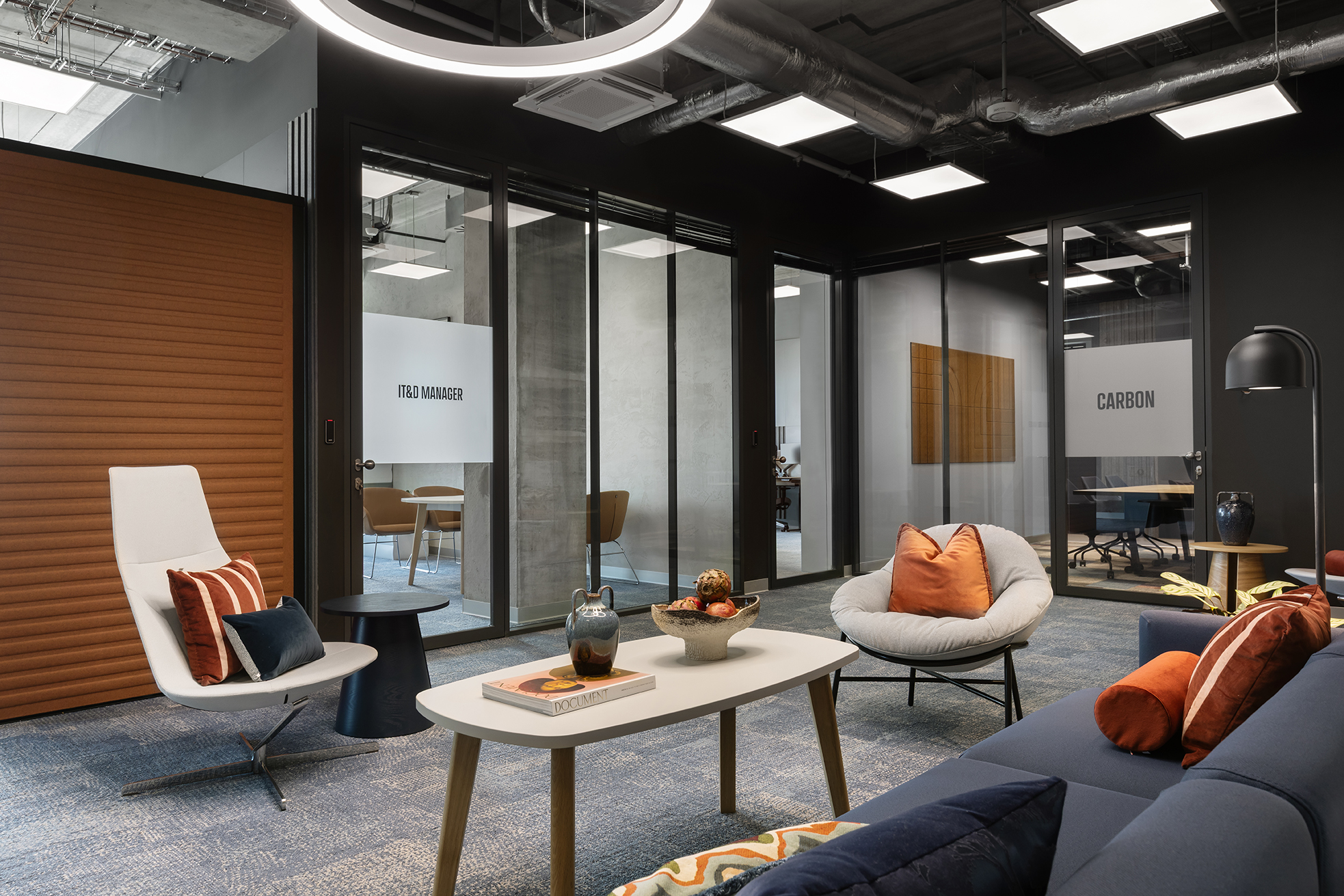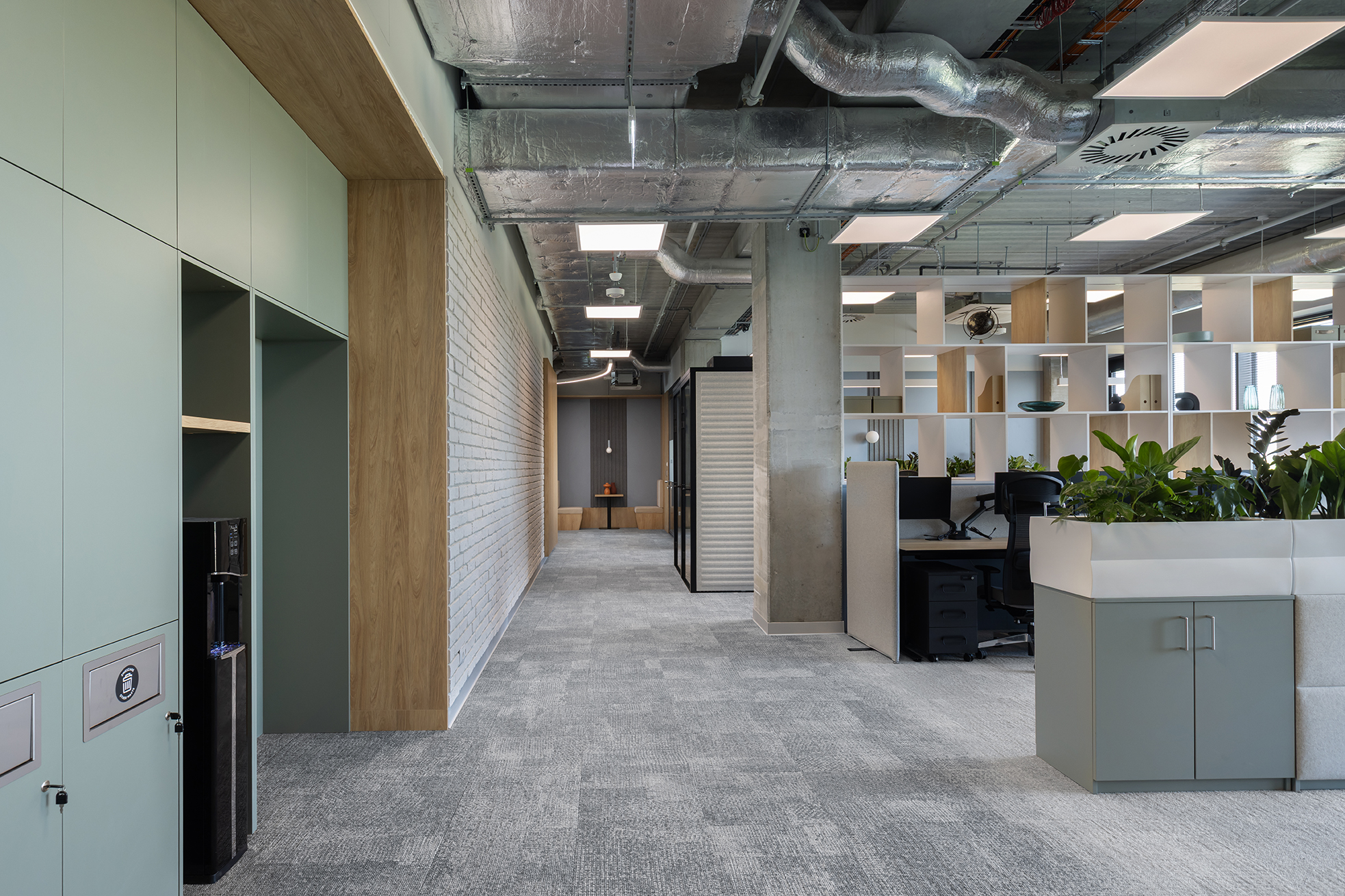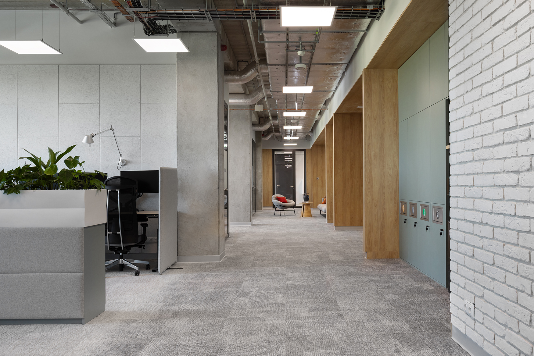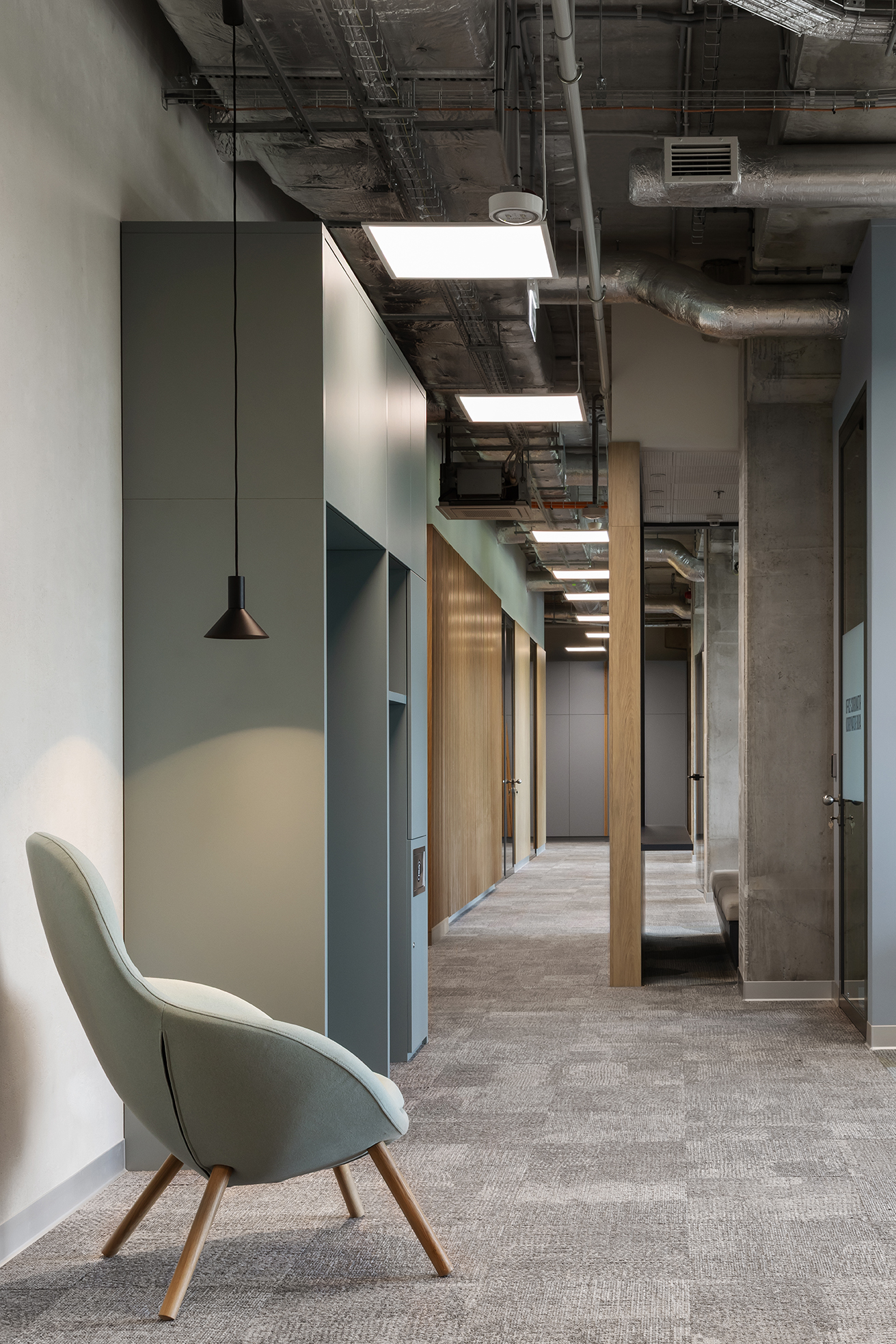 Istotnym elementem tej części biura jest duża, kolektywna przestrzeń odpoczynku, zaprojektowana jako miejsce nieformalnych spotkań oraz integracji. Układ funkcjonalny oparto na korytarzowej komunikacji, przy której zlokalizowano liczne półotwarte biura przeznaczone dla kilkuosobowych zespołów. Taka organizacja przestrzeni pozwala zachować równowagę pomiędzy współpracą w małych grupach a możliwością skupionej pracy indywidualnej. Uzupełnieniem tej części są sale konferencyjne o zróżnicowanej wielkości.