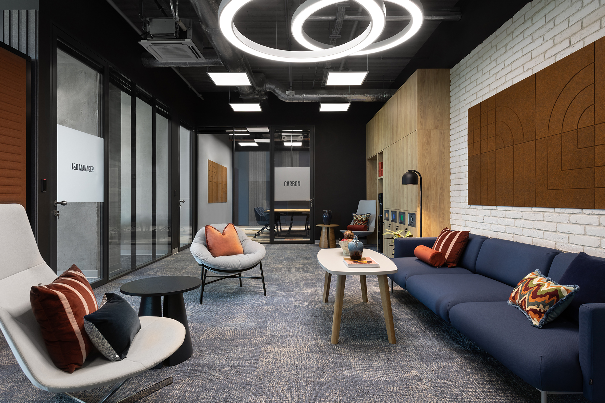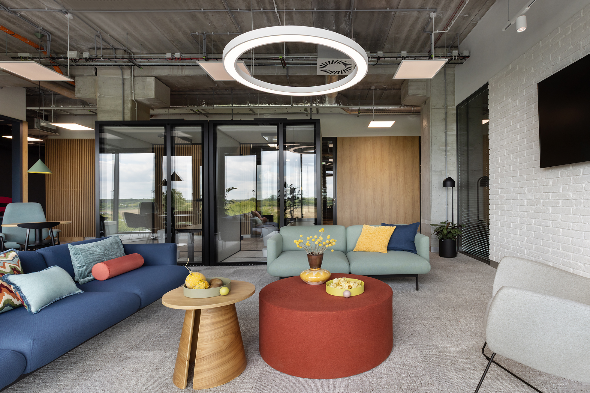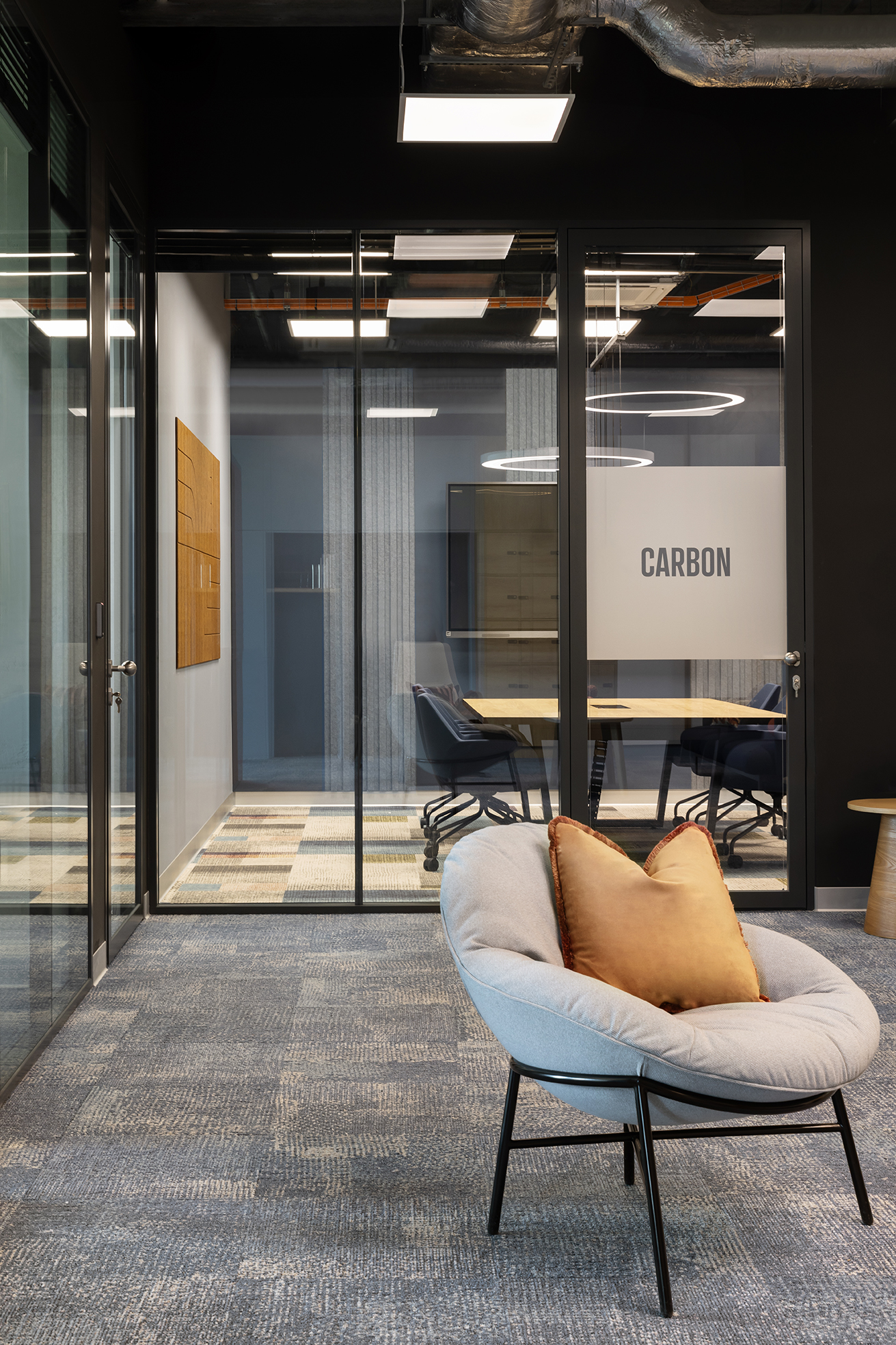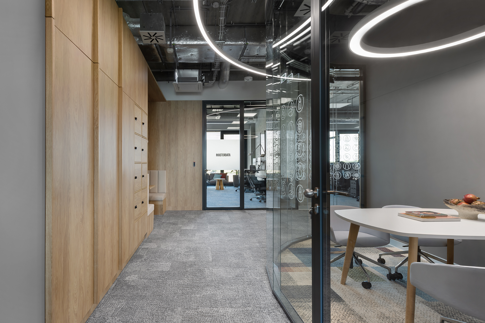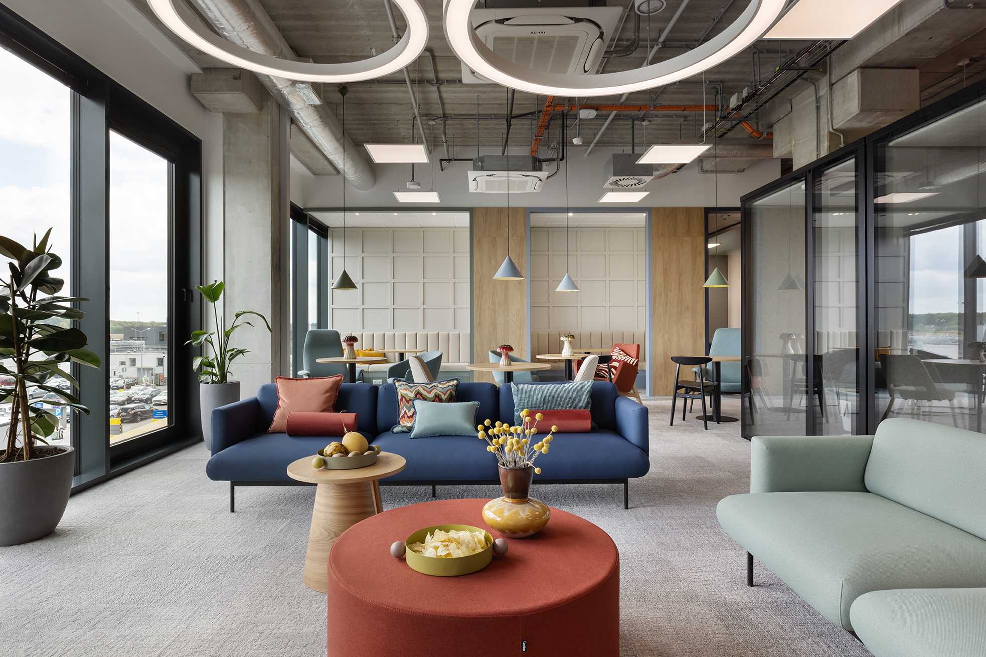 Istotnym elementem tej części biura jest duża, kolektywna przestrzeń odpoczynku, zaprojektowana jako miejsce nieformalnych spotkań oraz integracji. Układ funkcjonalny oparto na korytarzowej komunikacji, przy której zlokalizowano liczne półotwarte biura przeznaczone dla kilkuosobowych zespołów. Taka organizacja przestrzeni pozwala zachować równowagę pomiędzy współpracą w małych grupach a możliwością skupionej pracy indywidualnej. Uzupełnieniem tej części są sale konferencyjne o zróżnicowanej wielkości.