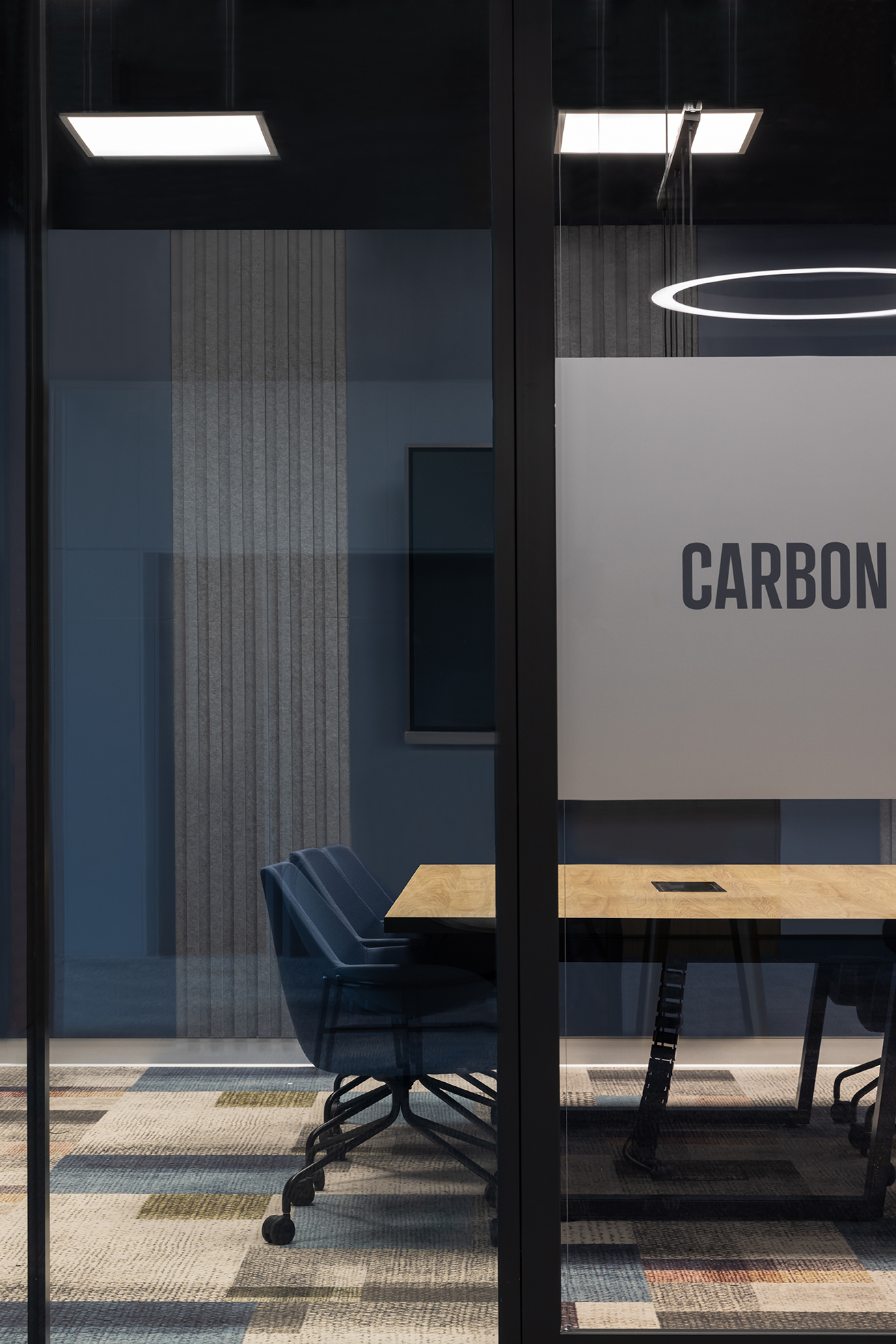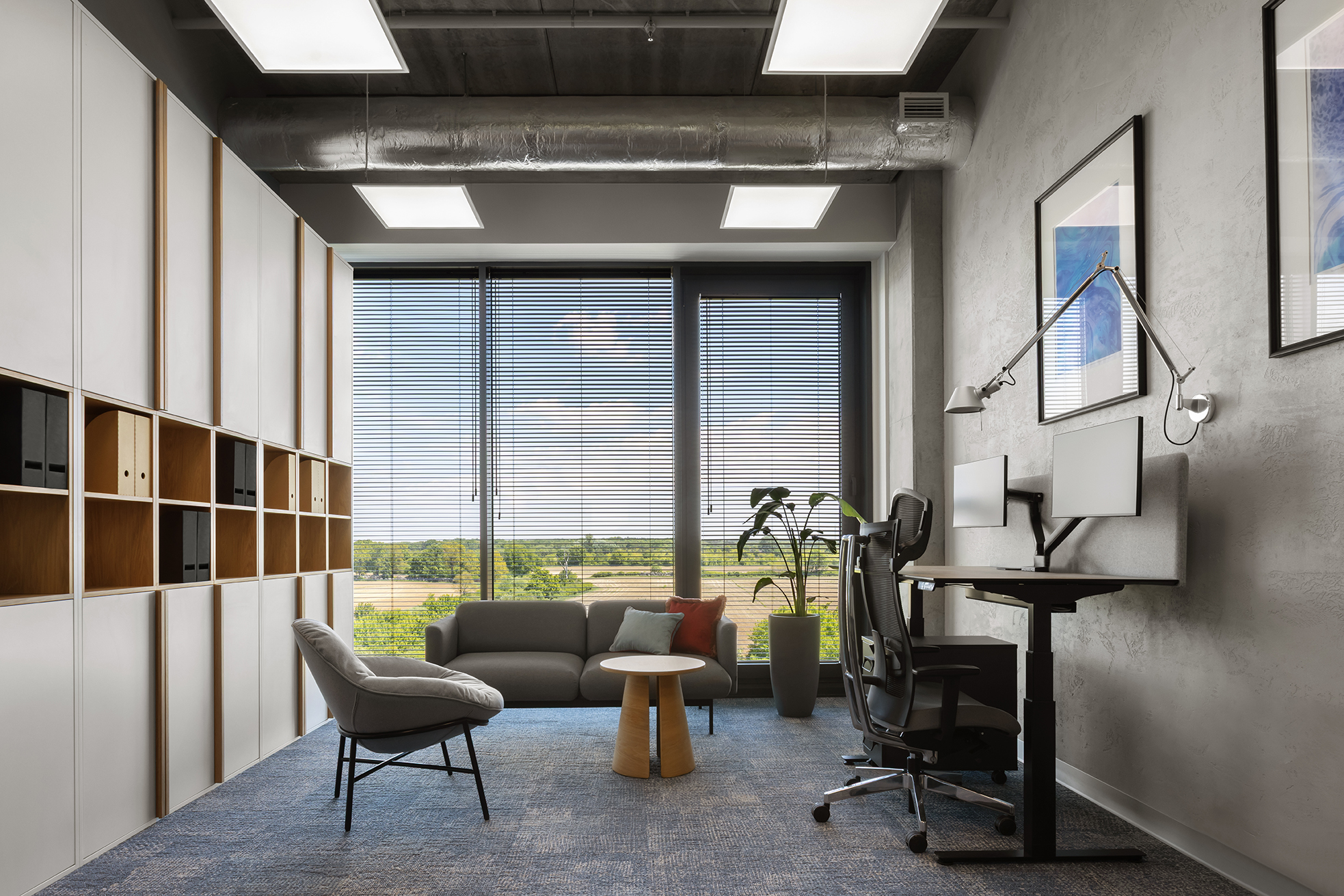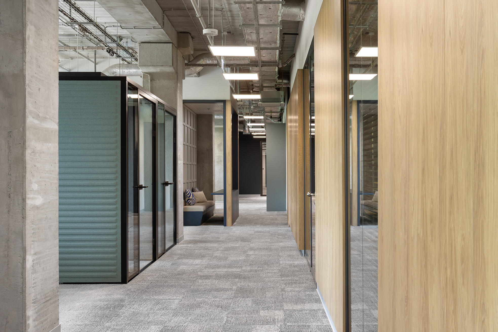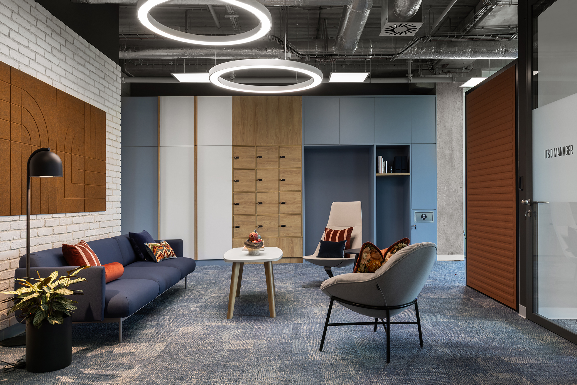 Istotnym elementem tej części biura jest duża, kolektywna przestrzeń odpoczynku, zaprojektowana jako miejsce nieformalnych spotkań oraz integracji. Układ funkcjonalny oparto na korytarzowej komunikacji, przy której zlokalizowano liczne półotwarte biura przeznaczone dla kilkuosobowych zespołów. Taka organizacja przestrzeni pozwala zachować równowagę pomiędzy współpracą w małych grupach a możliwością skupionej pracy indywidualnej. Uzupełnieniem tej części są sale konferencyjne o zróżnicowanej wielkości.
