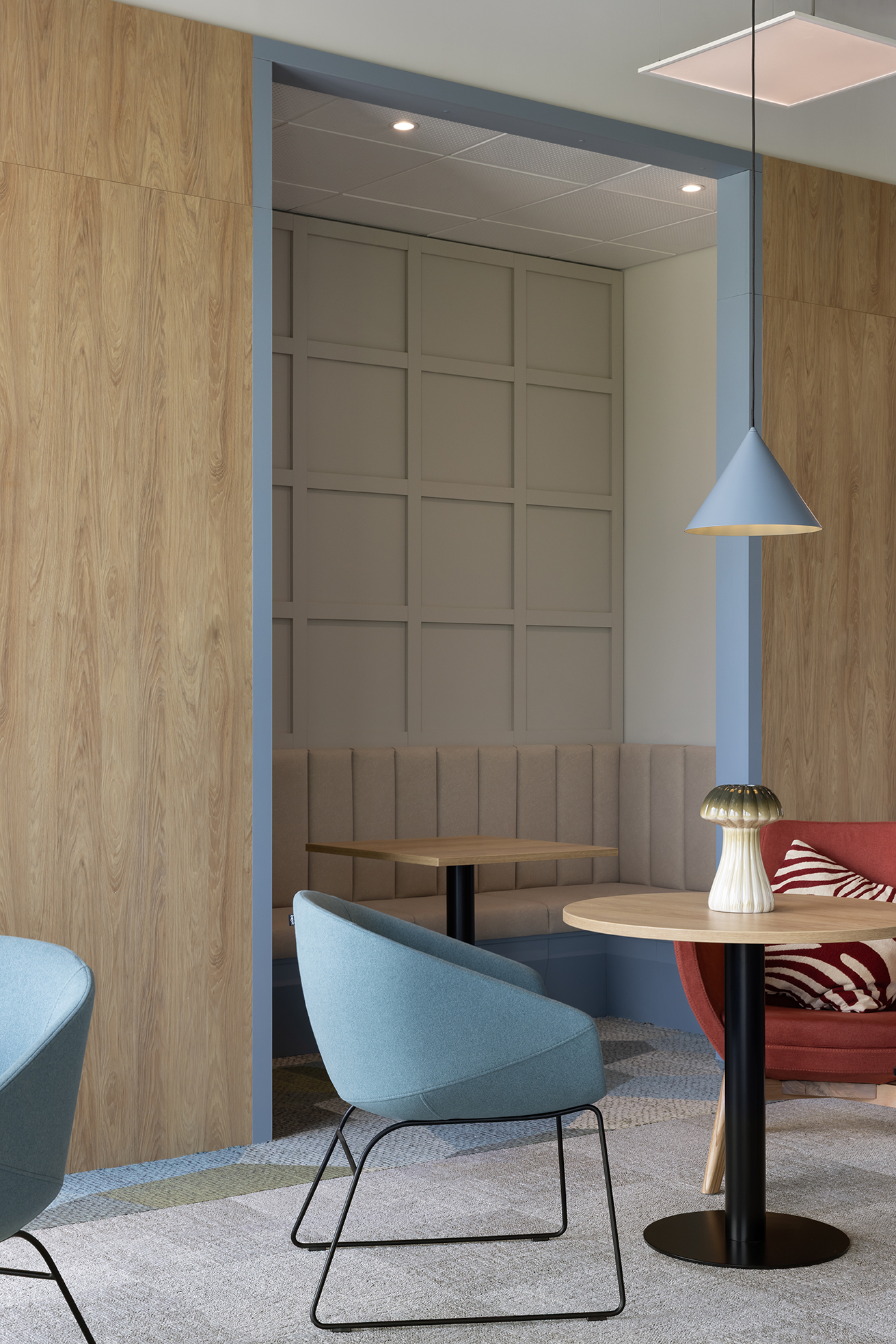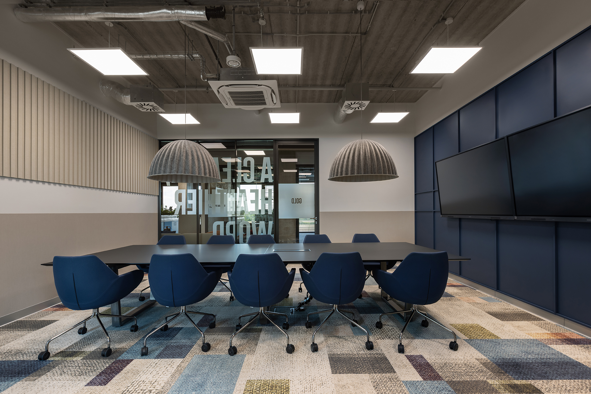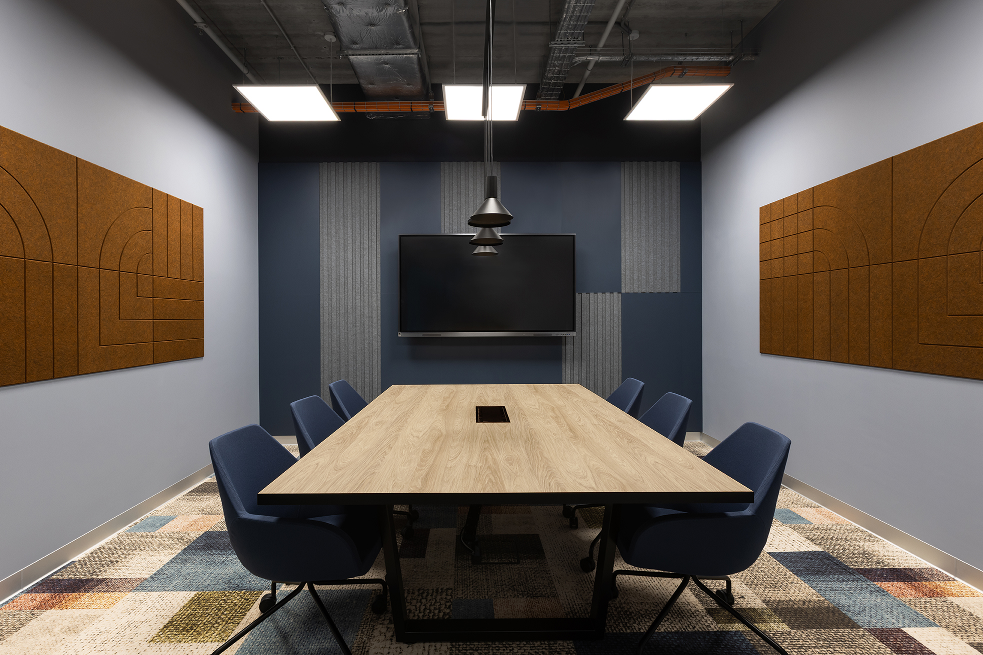Komfort akustyczny w całej przestrzeni zapewnia zastosowanie odpowiednio dobranych materiałów posadzkowych oraz paneli ściennych o właściwościach dźwiękochłonnych.