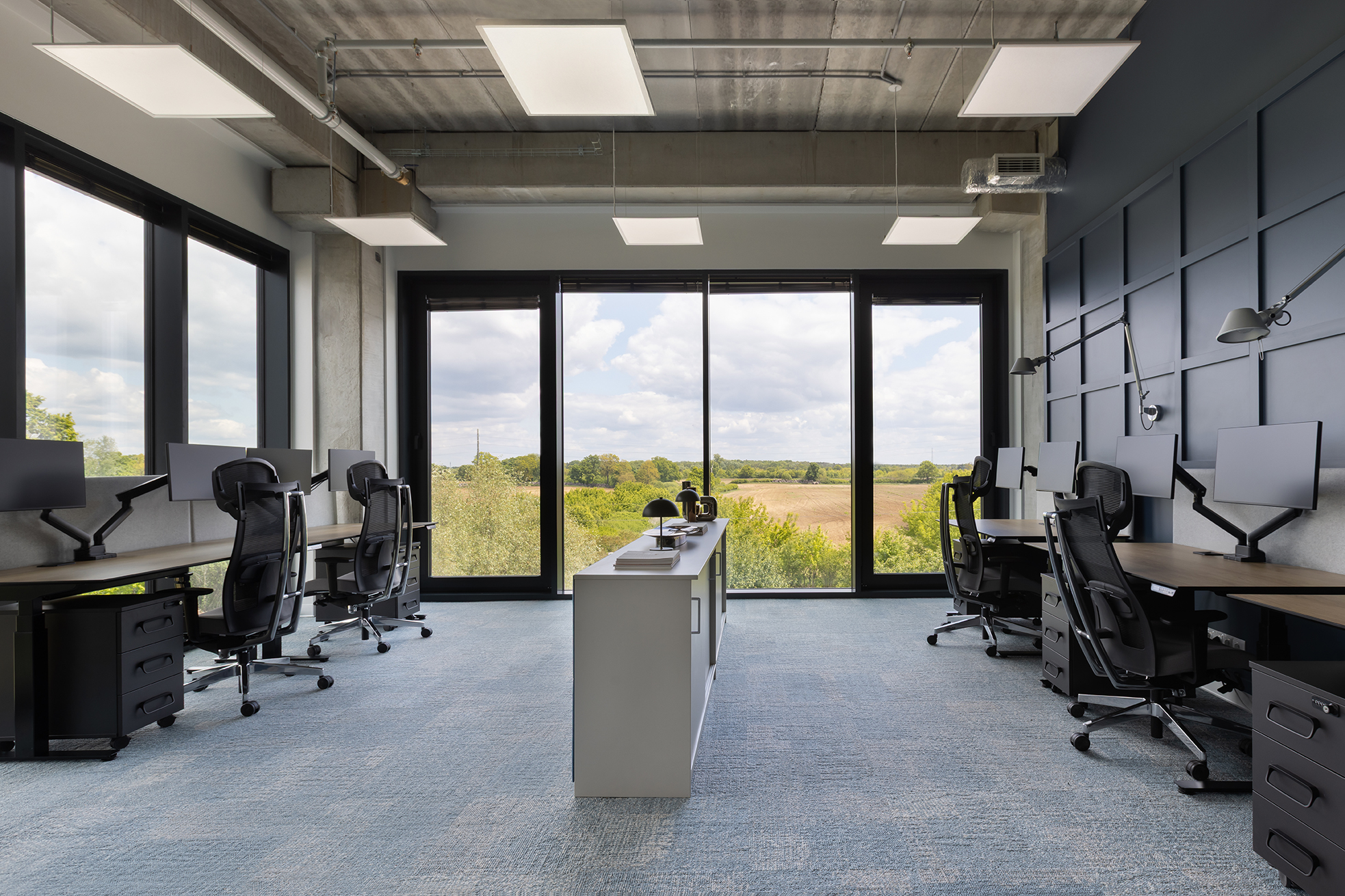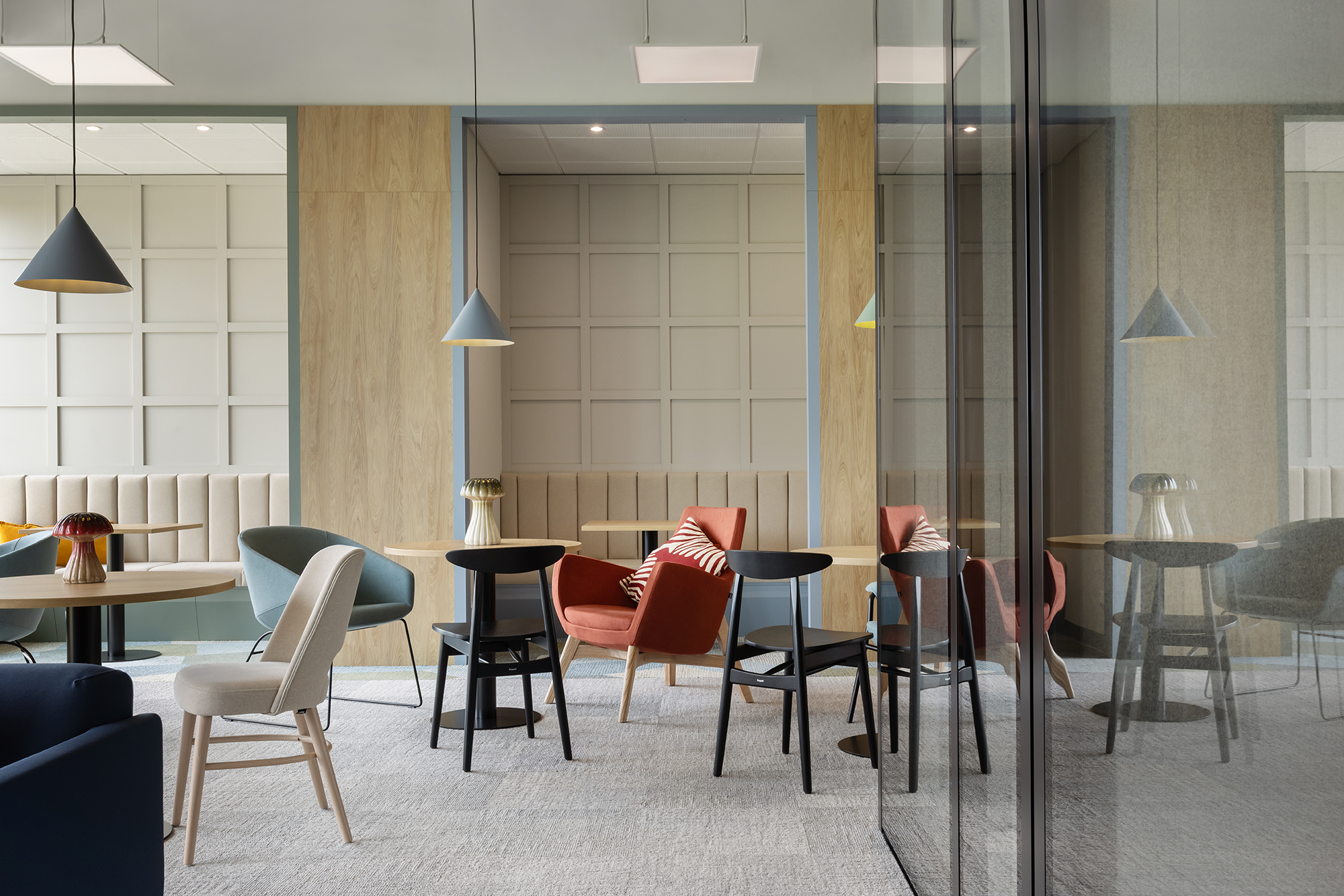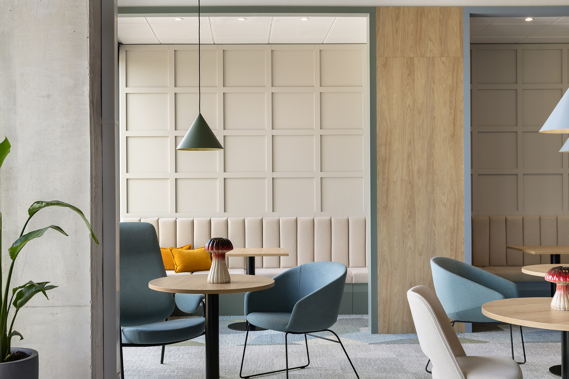 Komfort akustyczny w całej przestrzeni zapewnia zastosowanie odpowiednio dobranych materiałów posadzkowych oraz paneli ściennych o właściwościach dźwiękochłonnych.