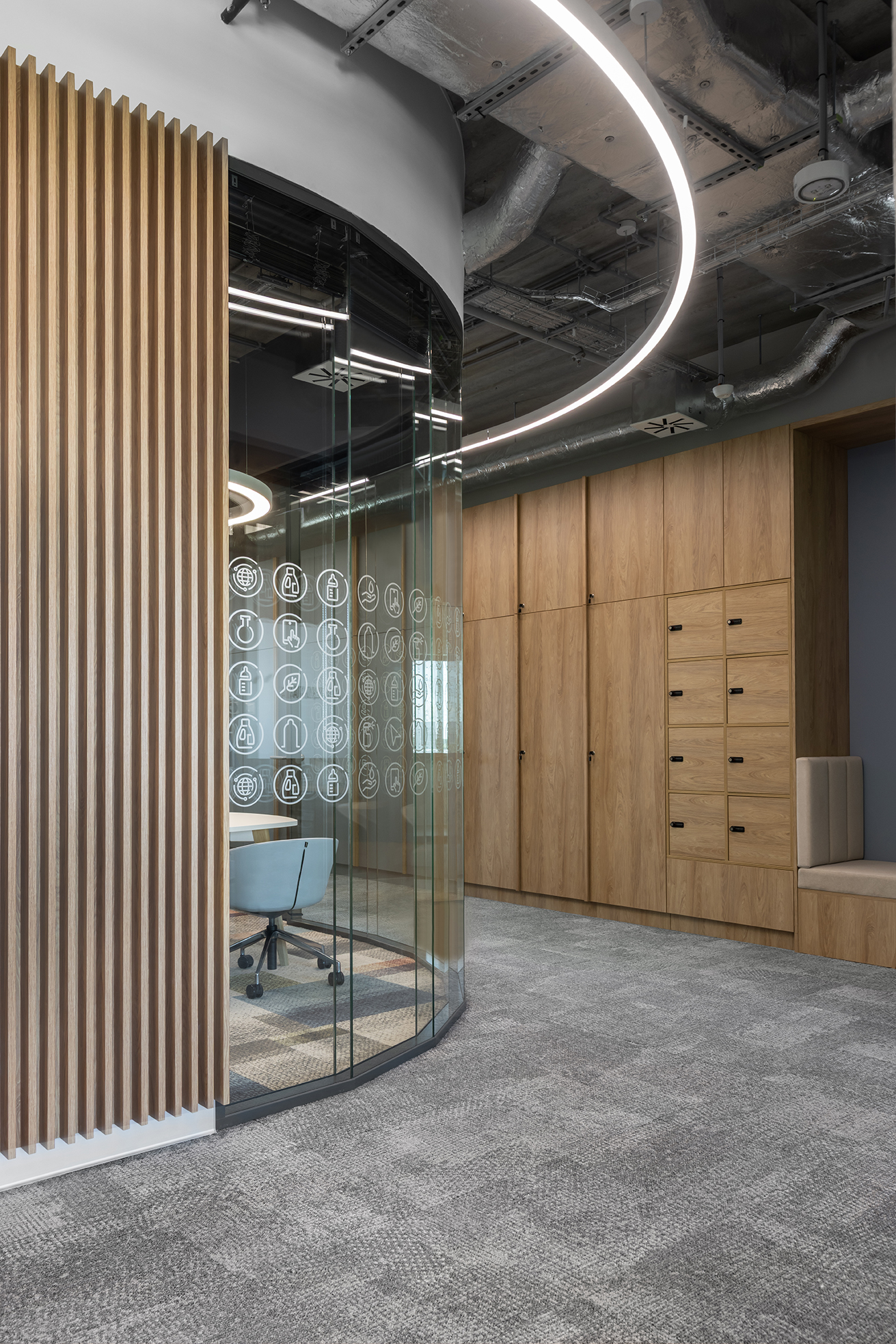 Projektowana przestrzeń stanowi jedną z części większego założenia biurowego przygotowanego dla międzynarodowej firmy produkcyjnej. Jej głównym założeniem było stworzenie środowiska pracy, które łączy miejsca przeznaczone do pracy zespołowej z rozbudowaną strefą relaksu i regeneracji dla pracowników.
