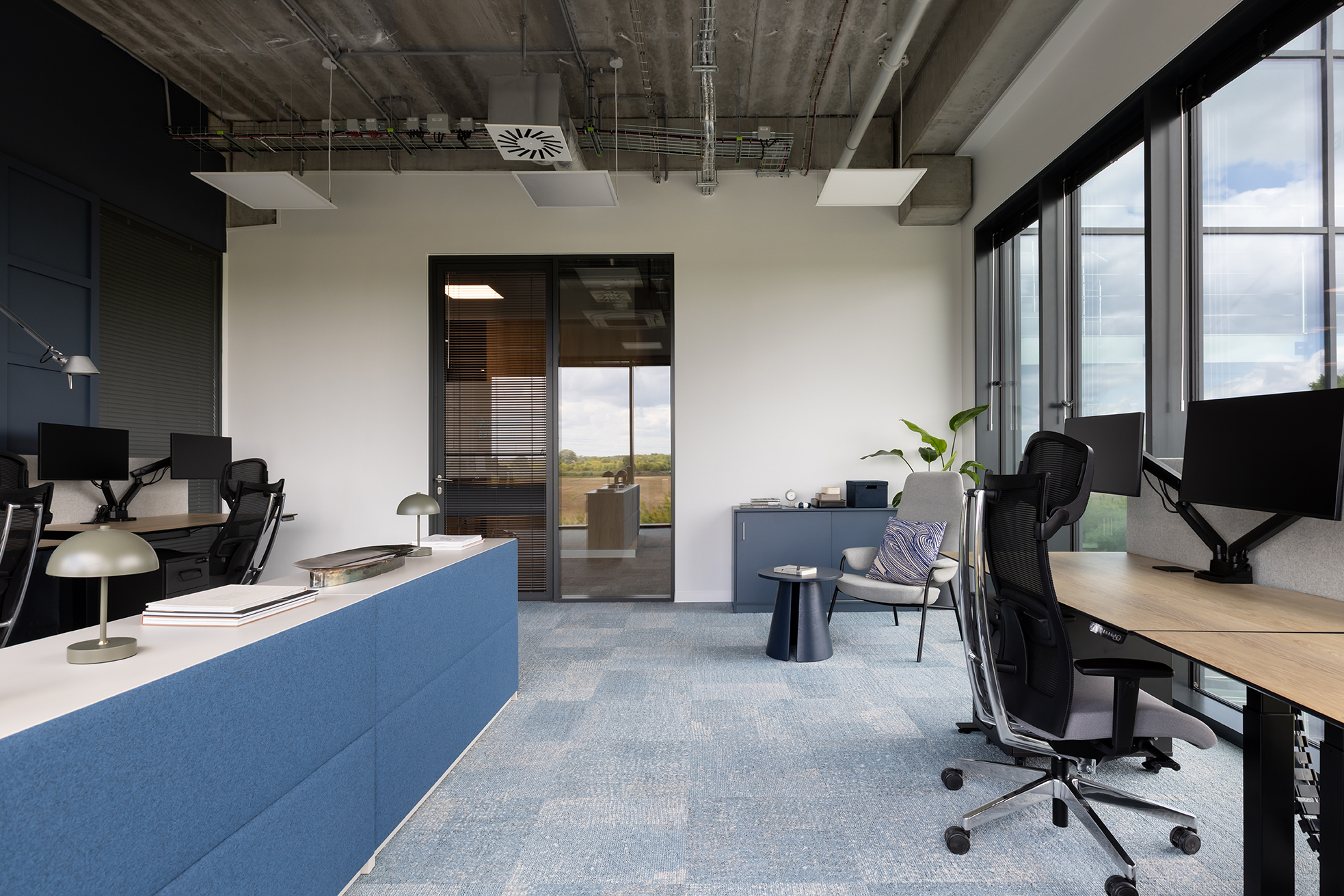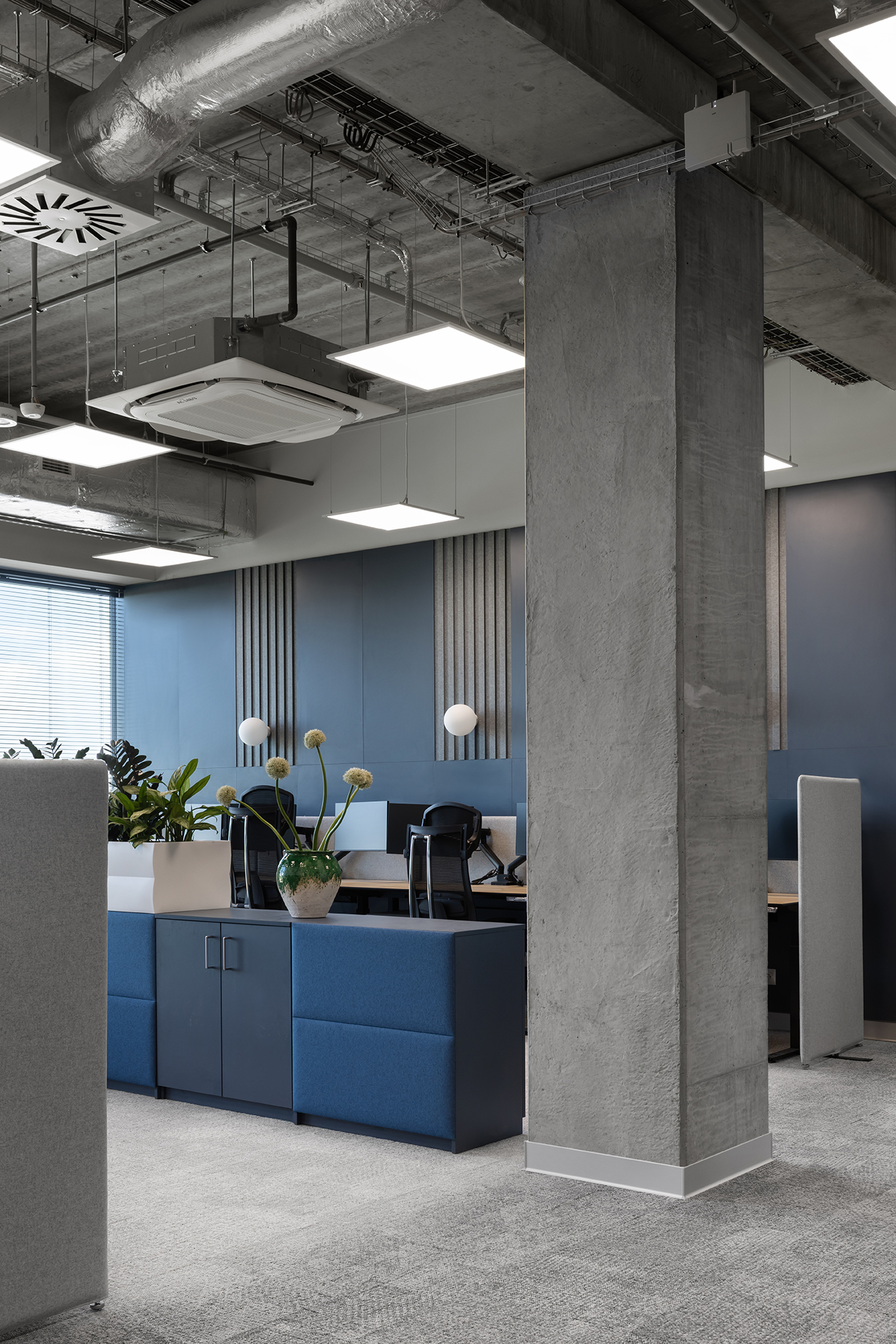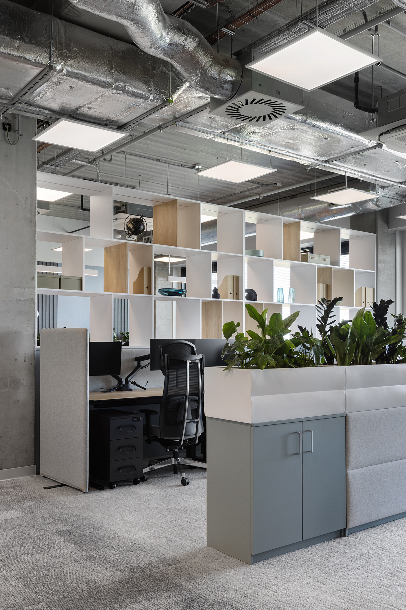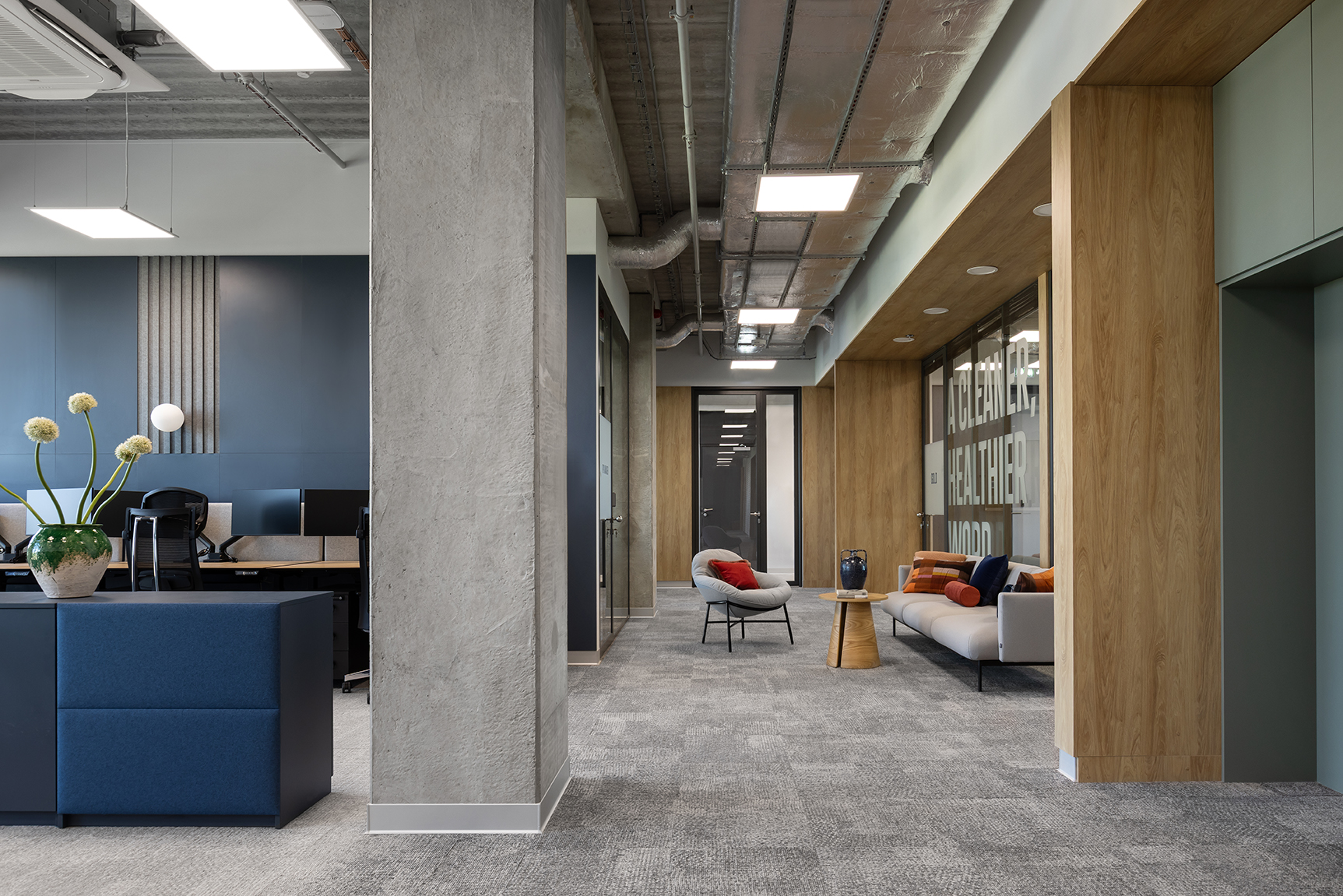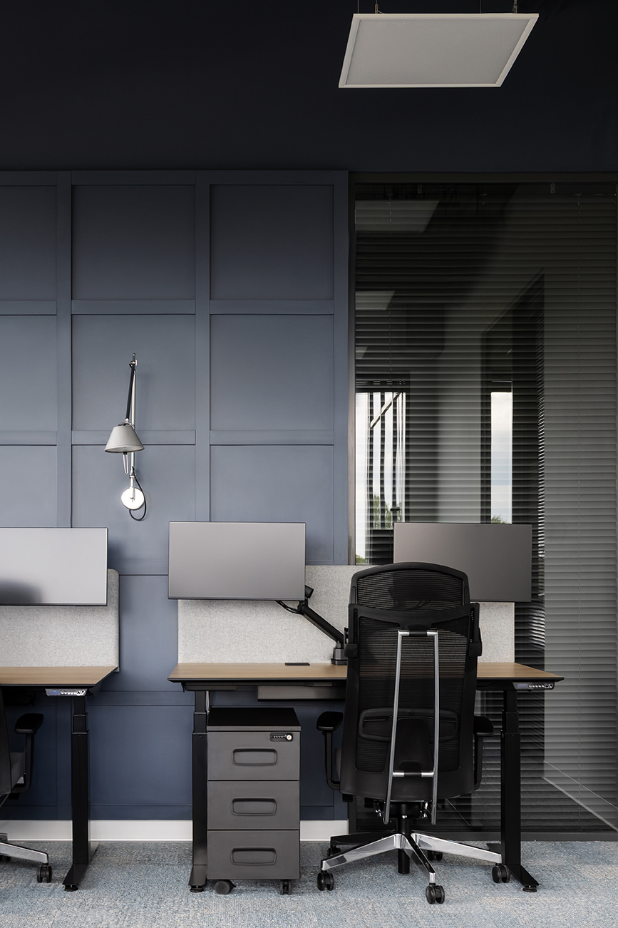 Istotnym elementem projektu jest również wydzielona strefa biura funkcjonująca w modelu pracy typu „hot desk”, przeznaczona dla pracowników, którzy nie posiadają przypisanego stanowiska i korzystają z przestrzeni w zależności od aktualnych potrzeb. Obszar ten wyposażono w elastyczne stanowiska pracy, własną strefę spotkań i odpoczynku, budki akustyczne do rozmów indywidualnych oraz sale konferencyjne umożliwiające prowadzenie spotkań zespołowych.