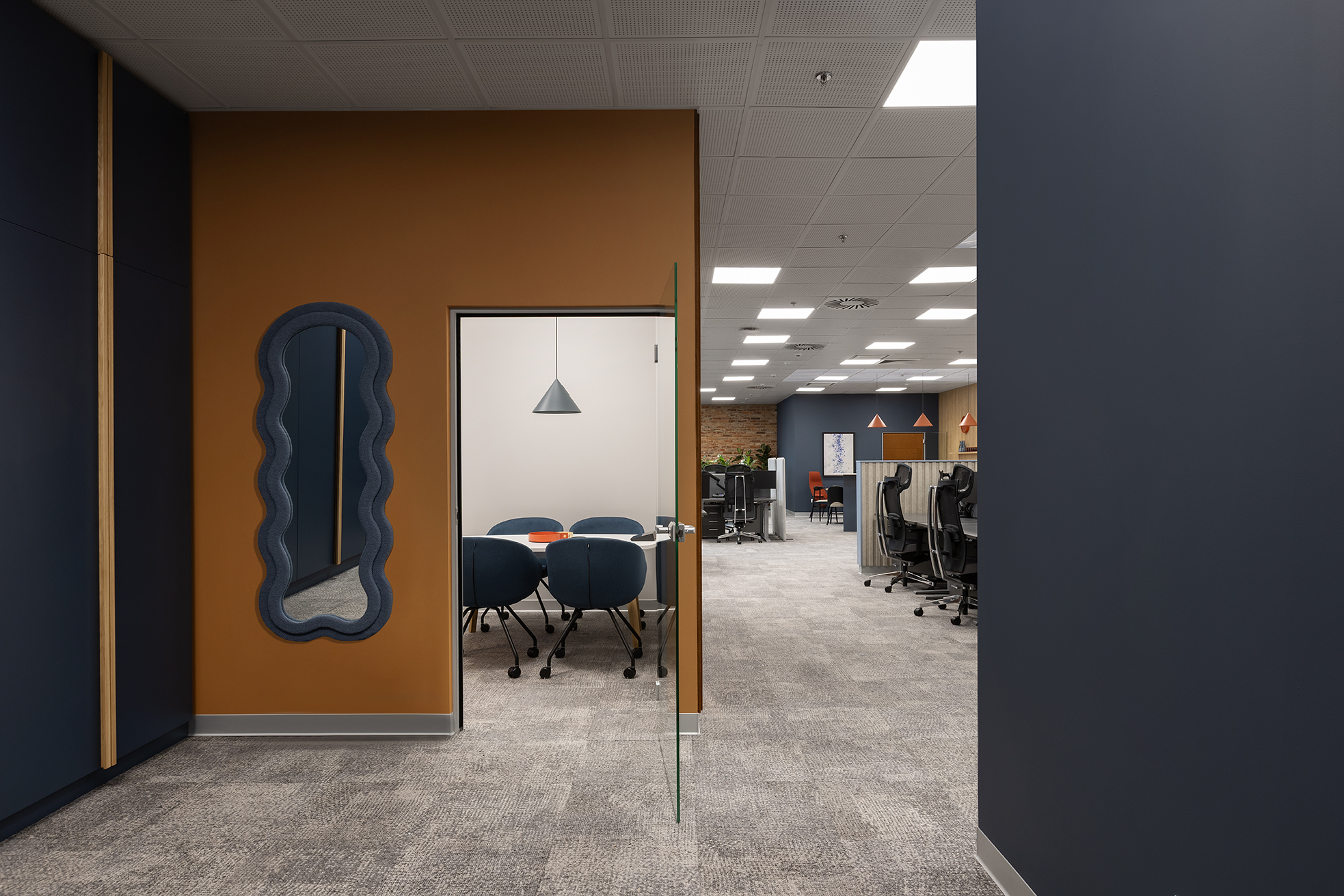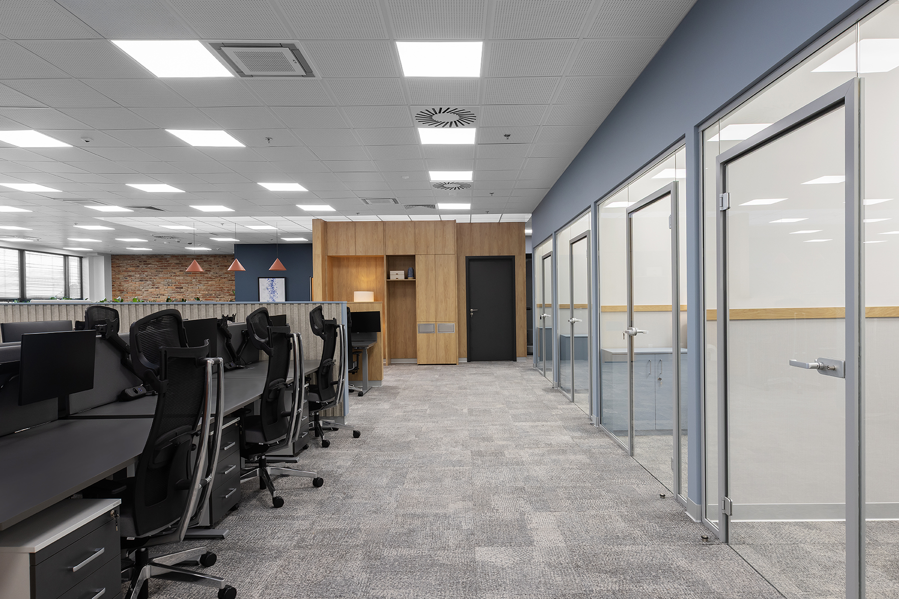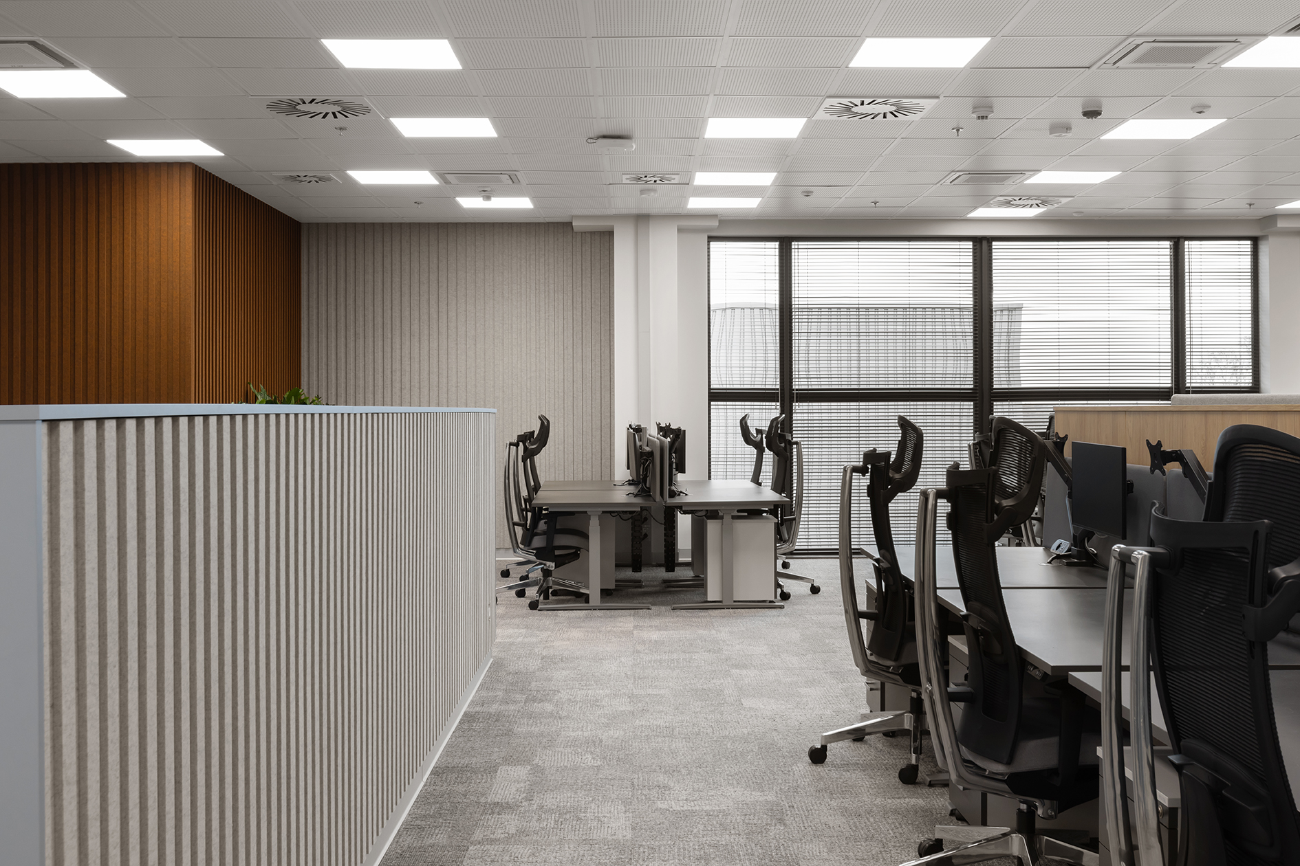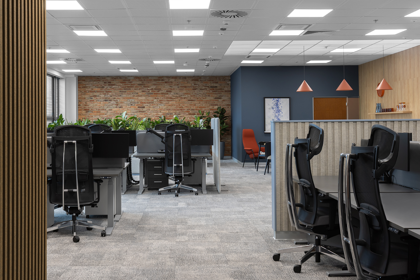 Całość została zaprojektowana z myślą o zapewnieniu komfortowych warunków pracy, przy jednoczesnym dostosowaniu przestrzeni do specyfiki organizacyjnej zespołów.