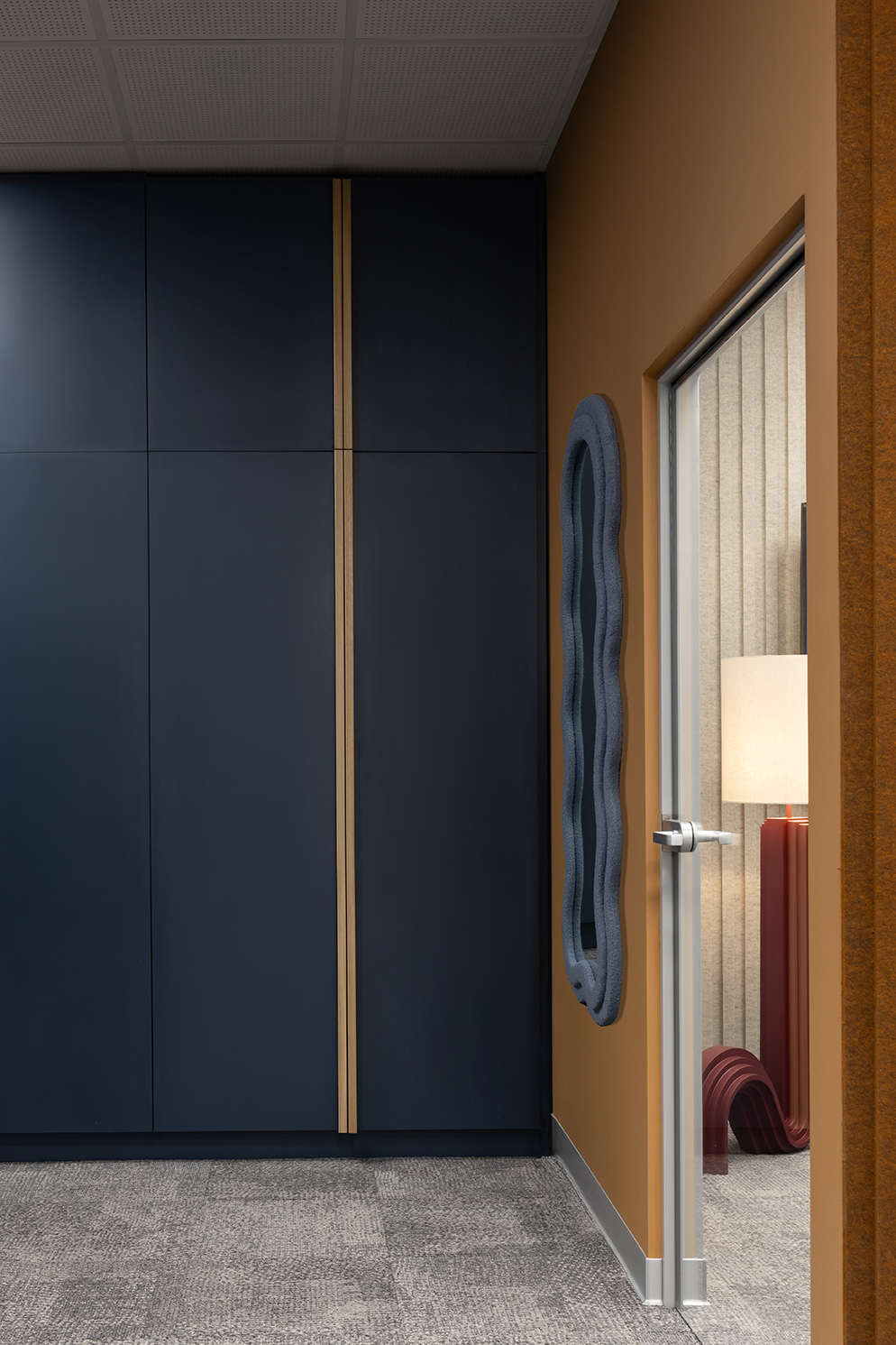 Charakter pracy działu wymagał również zaprojektowania licznych pomieszczeń zaplecza wspierających codzienne funkcjonowanie zespołów. Ze względu na ograniczoną ilość doświetlenia w części sufitów podwieszonych zastosowano przezierne panele, które umożliwiają przenikanie światła dziennego.