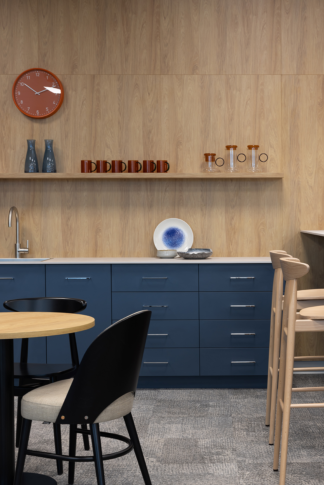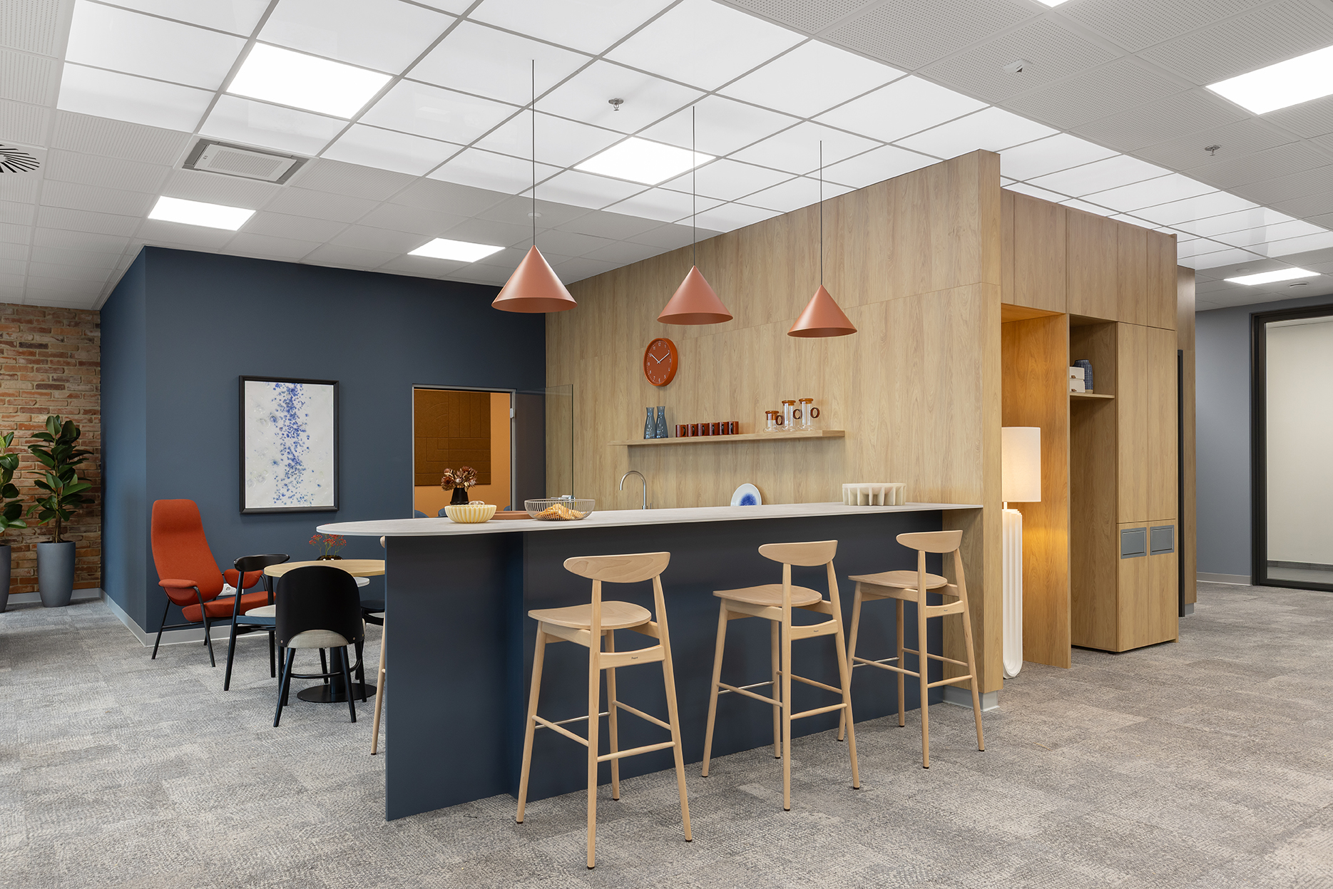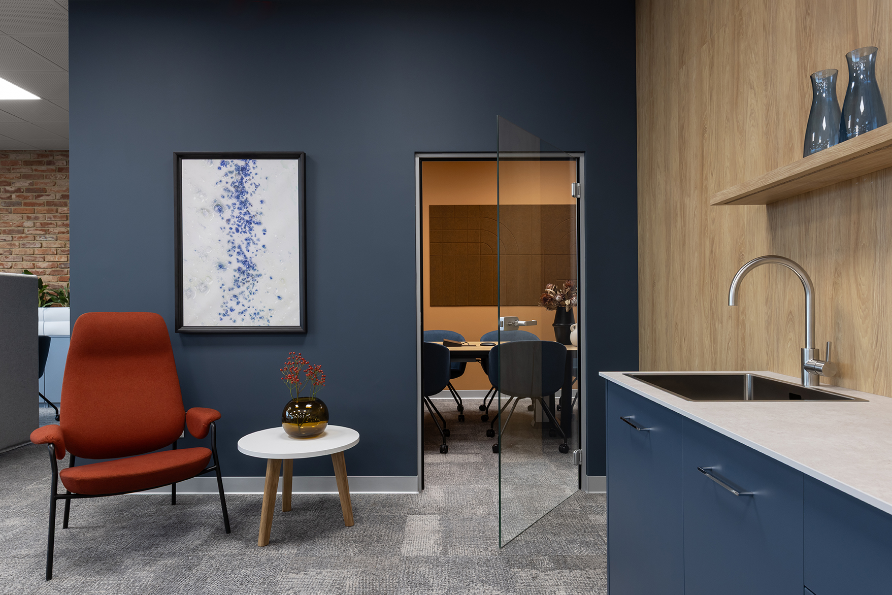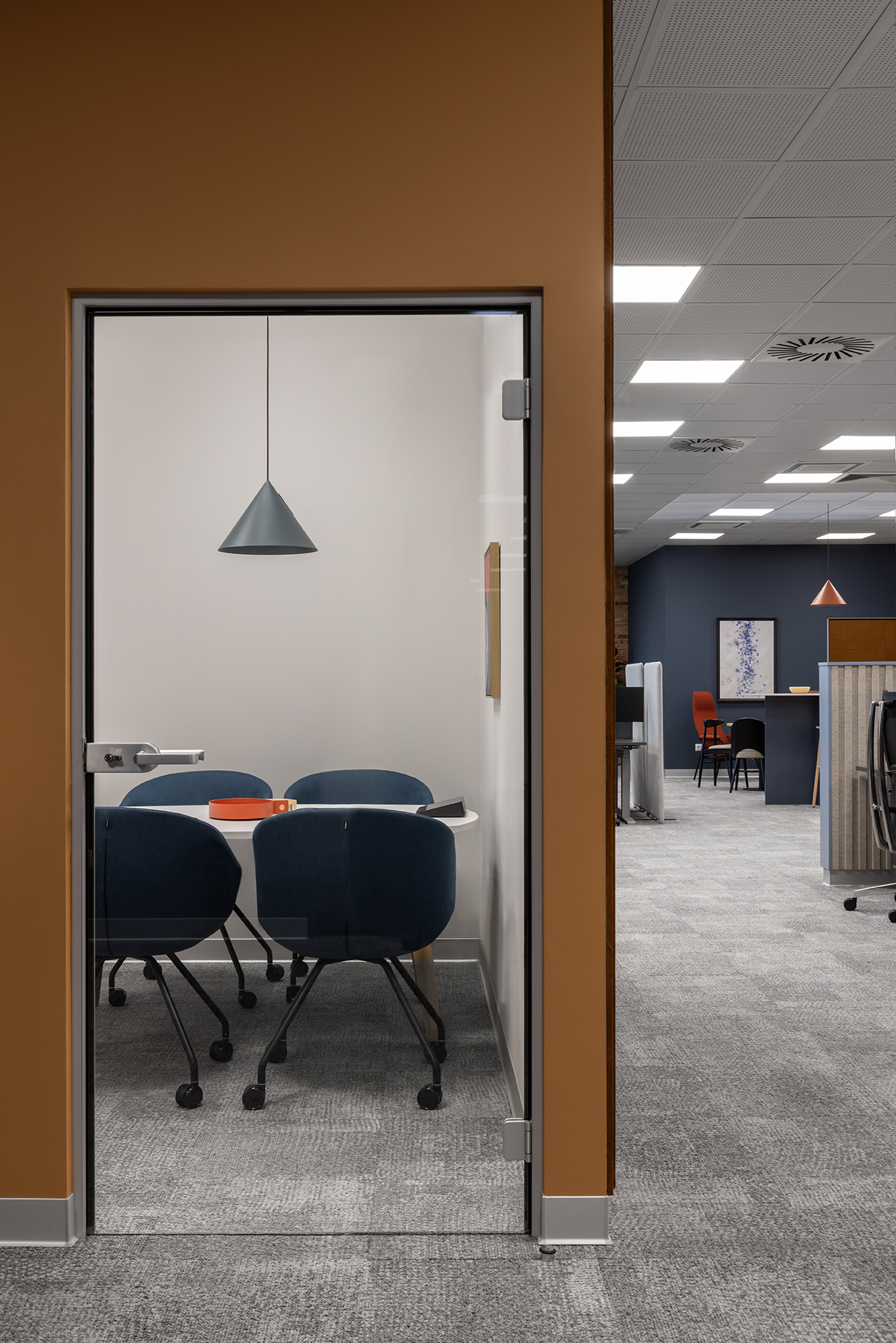 W efekcie powstał układ umożliwiający komfortową pracę indywidualną oraz sprawną komunikację pomiędzy zespołami. Do wyłącznej dyspozycji pracowników zaprojektowano dwie kameralne sale konferencyjne przeznaczone do spotkań zespołowych oraz niewielką strefę integracyjną z aneksem kawowym.