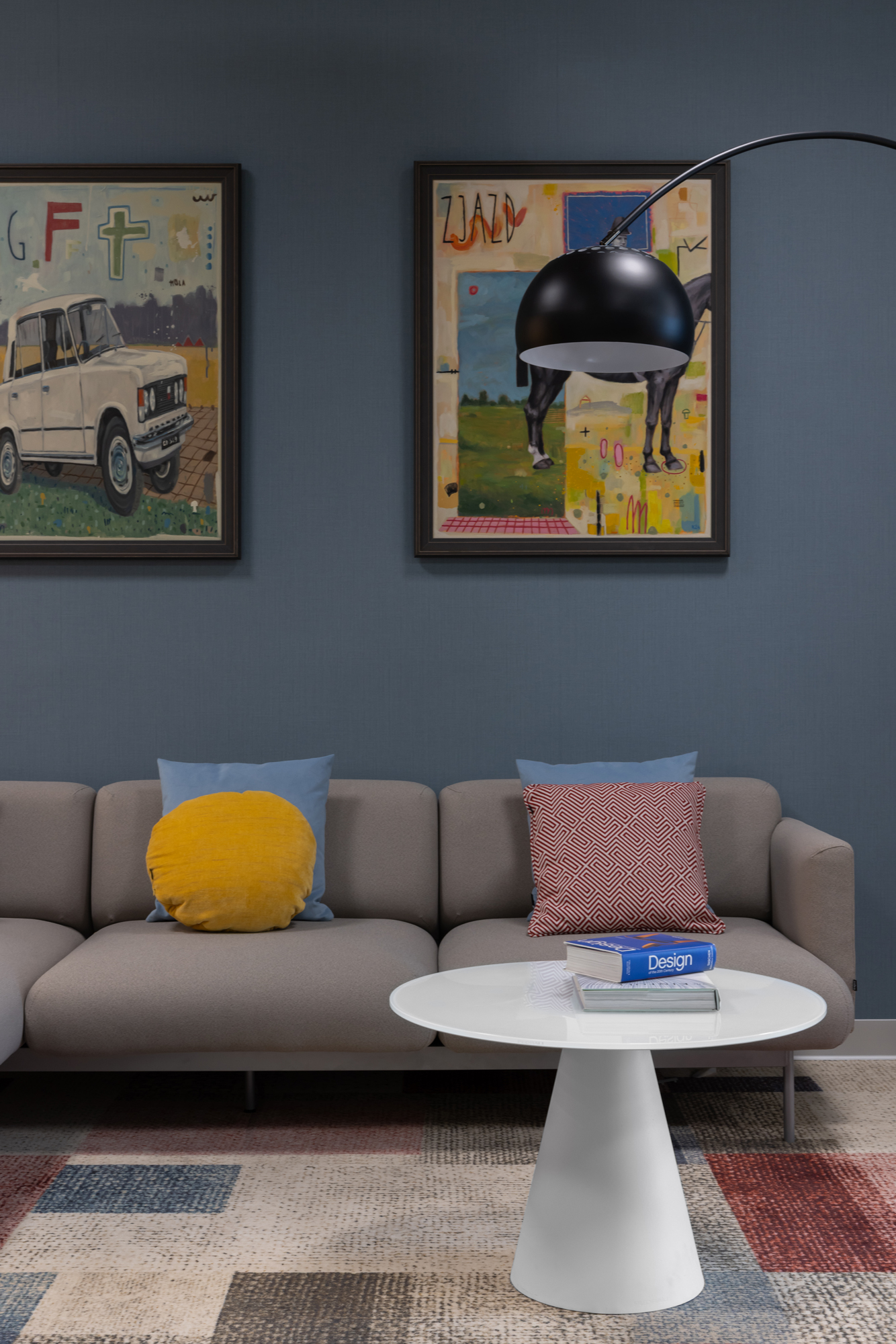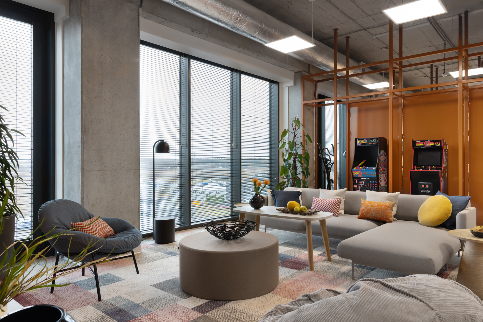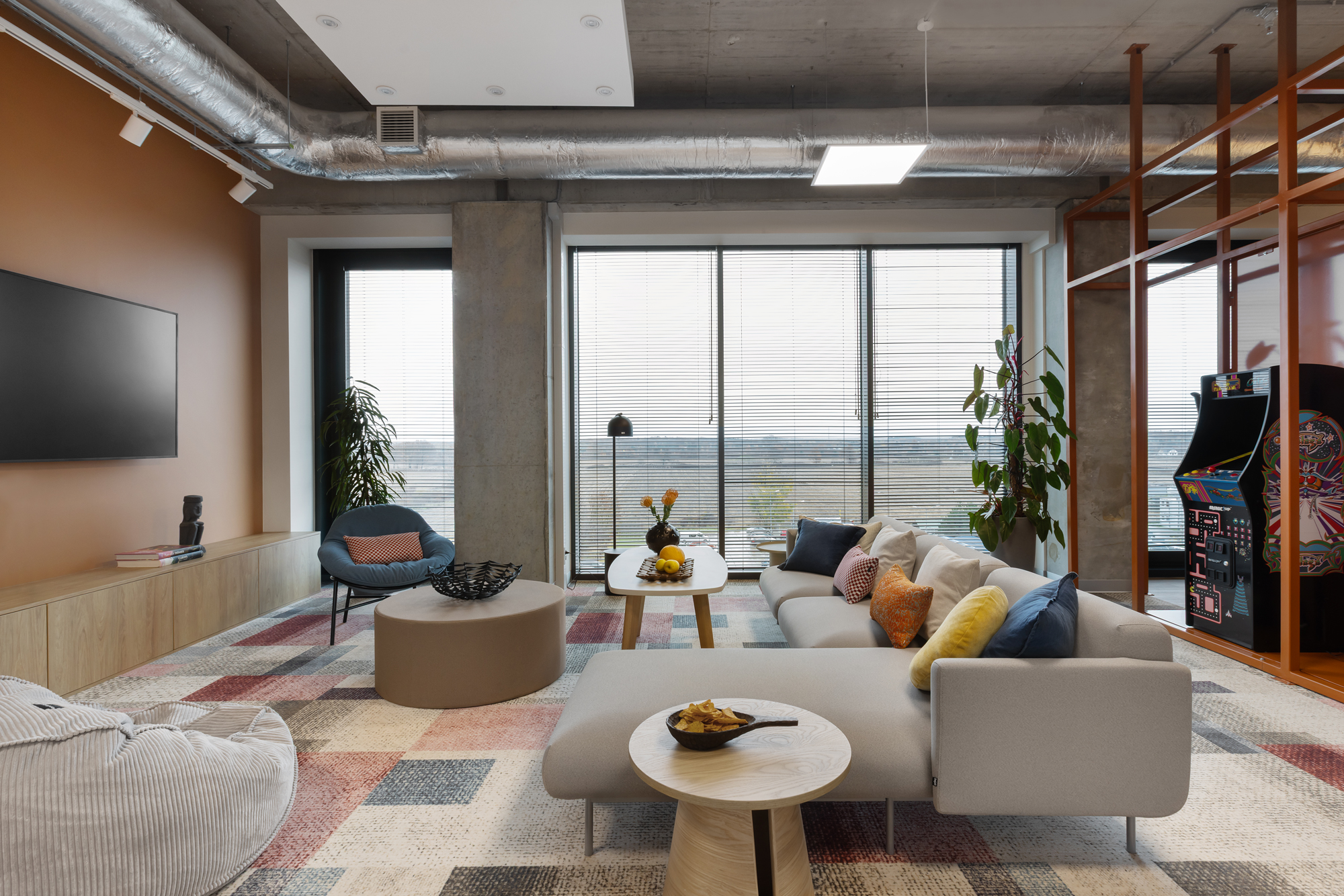 Przestrzeń zaprojektowano w sposób elastyczny – może służyć zarówno indywidualnemu odpoczynkowi, jak i spotkaniom większych grup. Dzięki wyraźnemu oddzieleniu od głównych powierzchni biurowych strefa relaksu zapewnia komfortowe warunki korzystania dla wszystkich pracowników, pozostając jednocześnie integralnym elementem całego kompleksu.