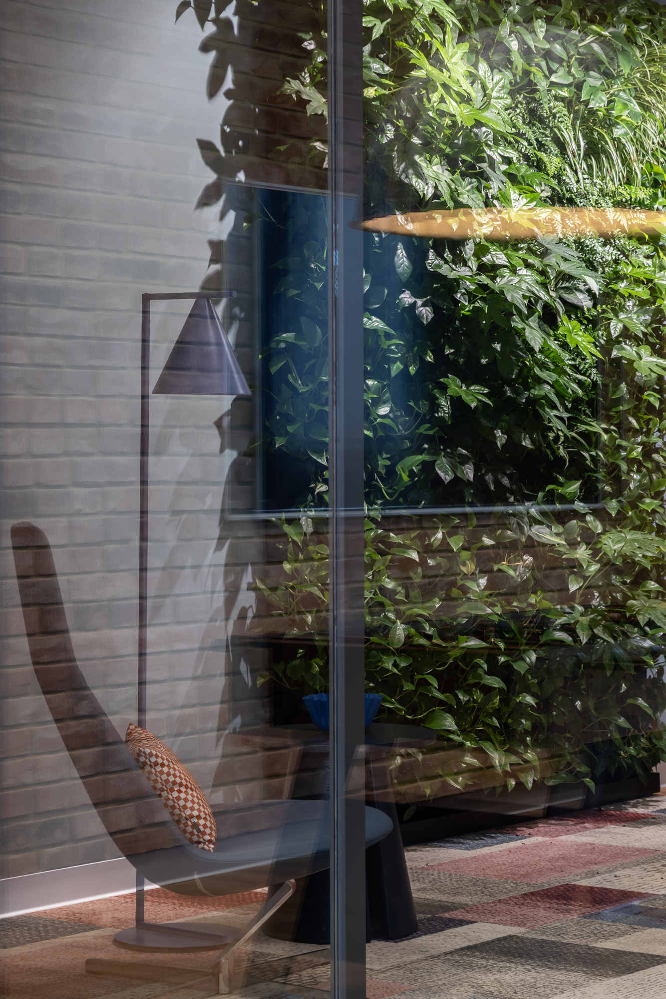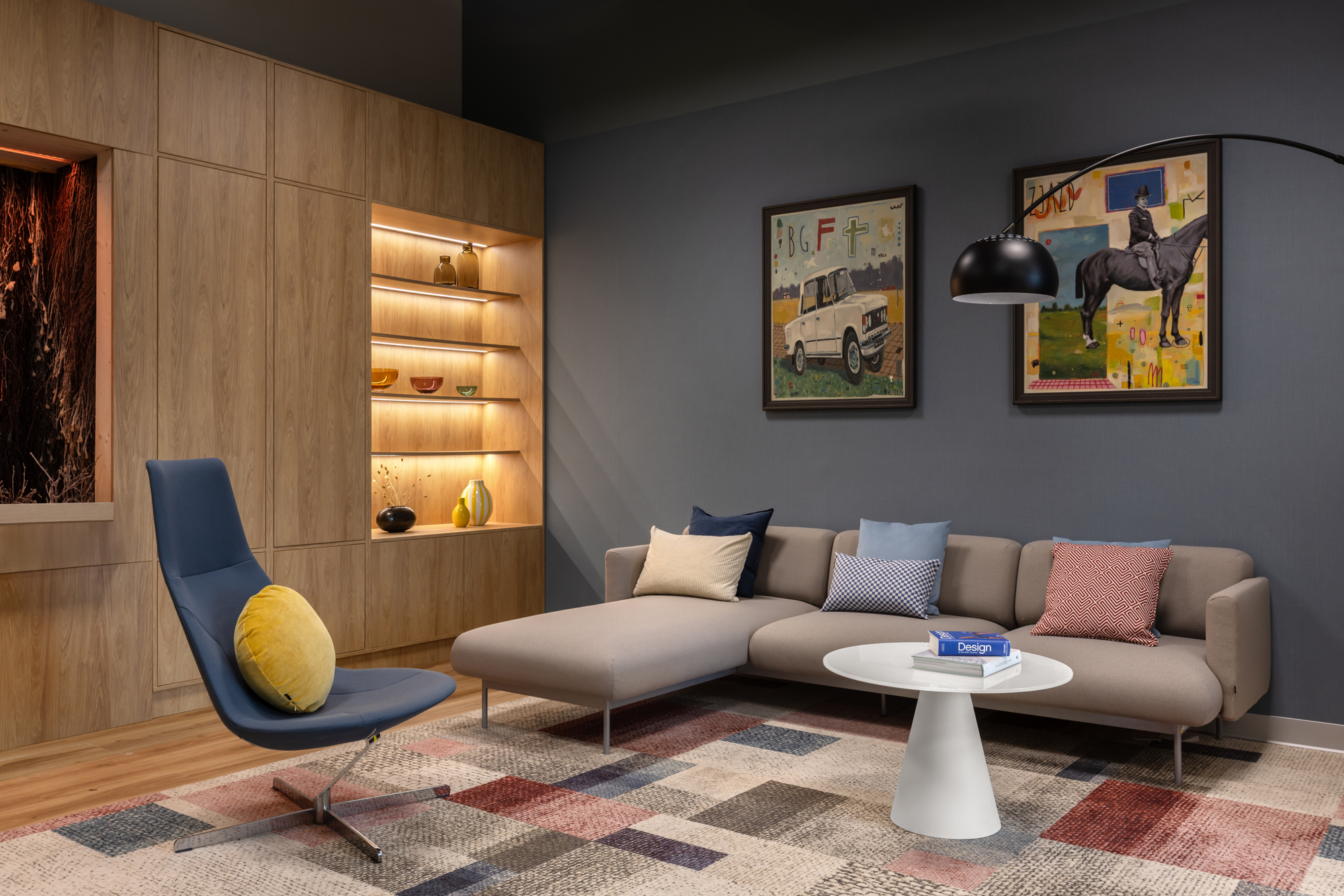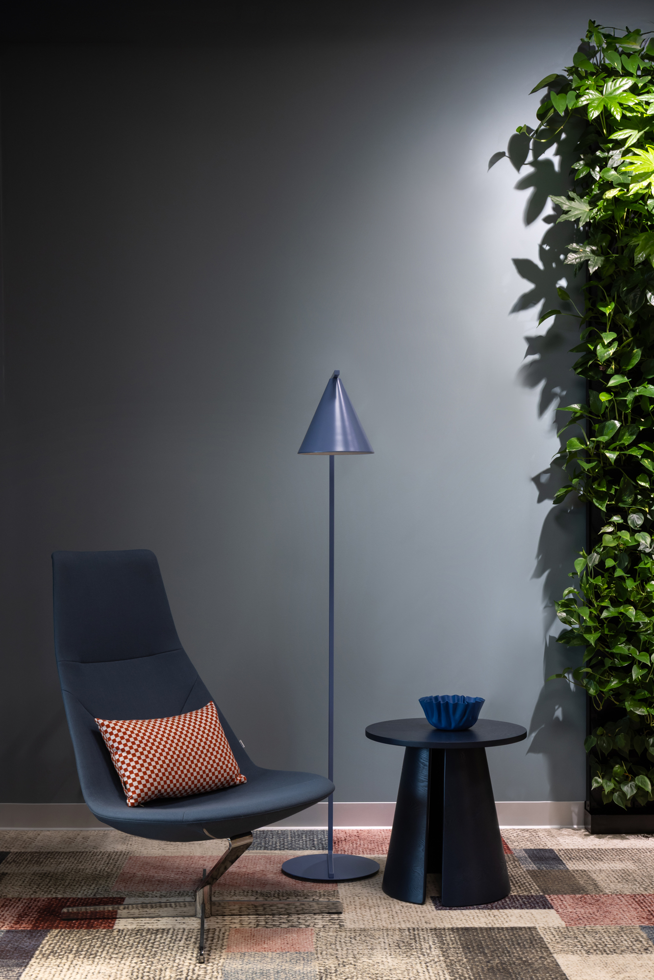 Przestrzeń zaprojektowano w sposób elastyczny – może służyć zarówno indywidualnemu odpoczynkowi, jak i spotkaniom większych grup. Dzięki wyraźnemu oddzieleniu od głównych powierzchni biurowych strefa relaksu zapewnia komfortowe warunki korzystania dla wszystkich pracowników, pozostając jednocześnie integralnym elementem całego kompleksu.